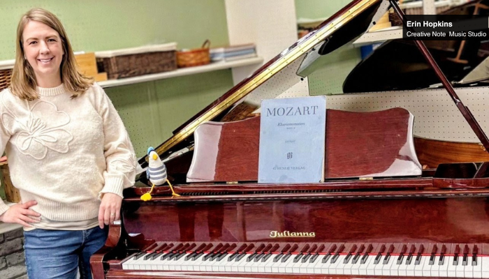 The business is owned and operated by Erin Hopkins, an Ontario Certified Teacher with a Bachelor of Music and a Bachelor of Education. She studied piano at Mount Allison University before earning her teaching degree from Queen’s University. After several years working as a full‑time classroom teacher, she transitioned into building her own music education business, driven by a passion for making high‑quality music instruction available within rural communities.